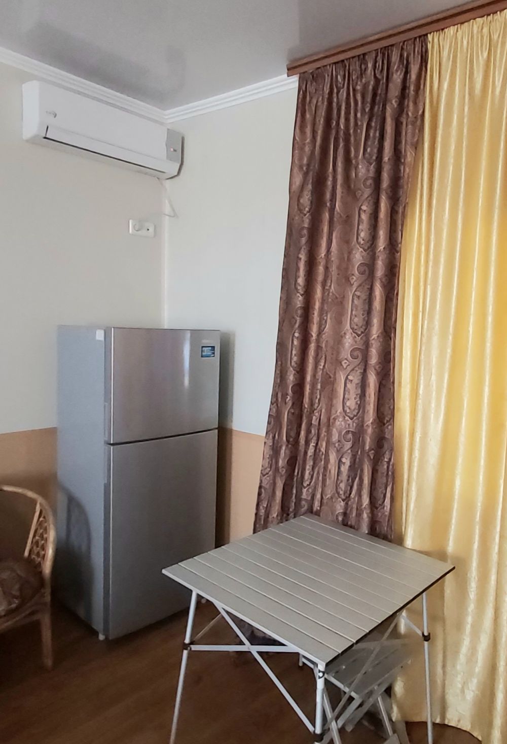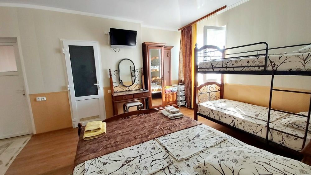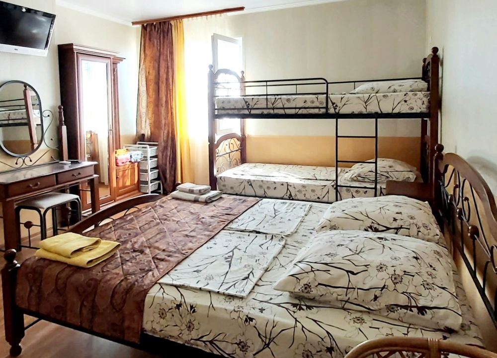 В номере двуспальная кровать + двухъярусная, мебель, двухкамерный холодильник, ТВ, кондиционер. Туалет, душ с круглосуточной горячей водой. Вода привозная.
