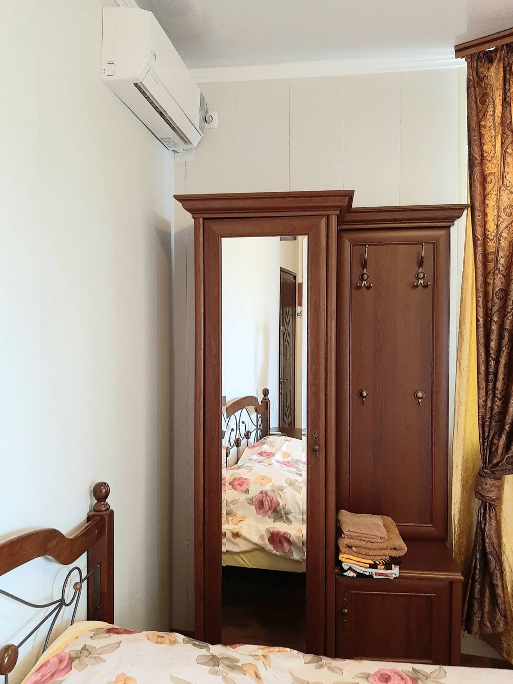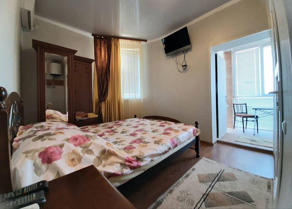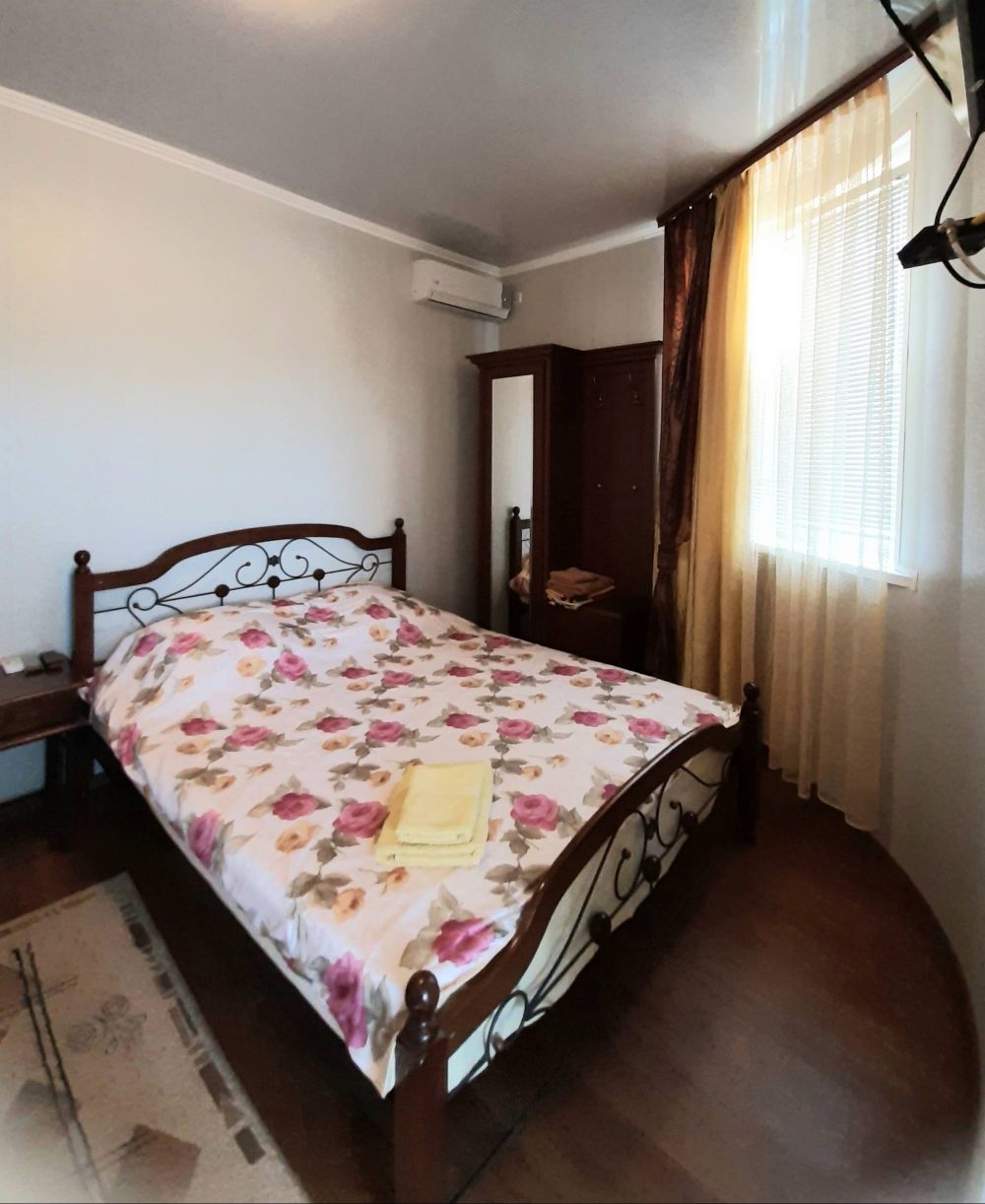 На 2-м этаже 4 номера ,в трёх своя кухня.Номер 4,площадью 11м.кв.,с балконом,оборудованным под мини-кухню.Окна выходят во двор,на фонтанчик.В номере двуспальная кровать,мебель,ТВ,холодильник,кондиционер.Туалет,душ с круглосуточной горячей водой.Вода привозная.