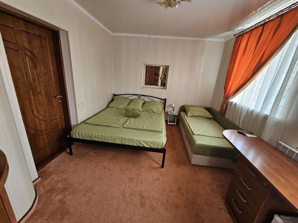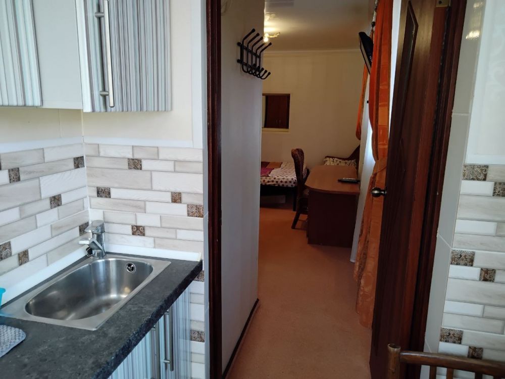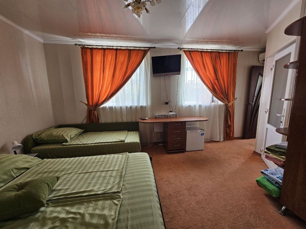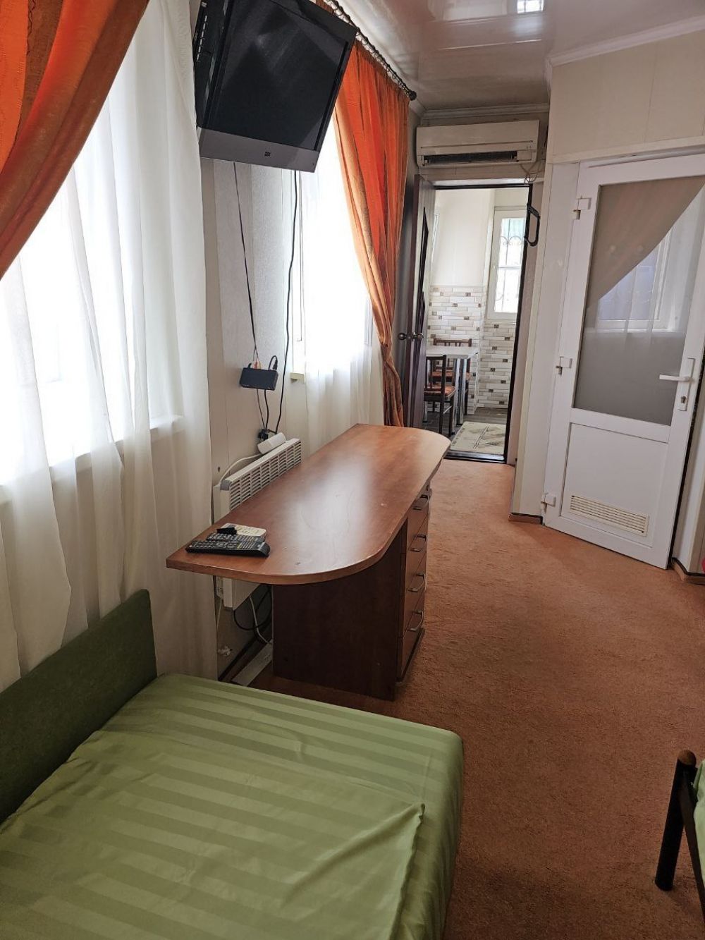 На 2-м этаже находятся четыре номера.Номер 7 площадью 12 м.кв.,двухместный +кушетка для ребенка,мини кухней на балконе.В номере двуспальная кровать,кушетка,шкаф,стол.На балконе кухня ,оборудована всем необходимым.Туалет,душ с круглосуточной горячей водой.Вода привозная.